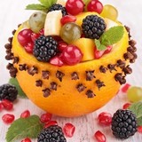 Pomaranč dobre umyte, osušte, ozdobte klinčekmi, zrežte vrchnú časť a ostrým nožíkom vyrežte dužinu, tak aby v nej klinčeky mohli zostať zapichnuté. Dužinu nakrájajte na malé kocky. Rovnako nakrájajte aj jablká, hrušky, mango a banán. Ovocie premiešajte s koktejlovými čerešňami, černicami, hroznom a zrniečkami granátového jablka. Pomarančovú šťavu zmiešajte s medom a malým množstvom škorice. Premiešajte s ovocím. Pomaranče naplňte ovocným šalátom a ozdobte mätou.